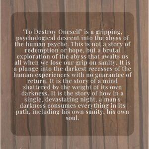 “To Destroy Oneself” by Zoya Usman is a fearless and unfiltered journey into the depths of the human psyche. The unnamed narrator crafts a story that merges reality with imagination, revealing the weight of suppressed emotions, unspoken truths, and the silent wars waged within the mind.